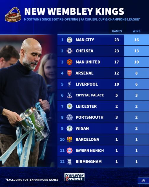 蓝月军团造访新温布利23次,赢了其中16场。这段时间他们拿了三个足总杯、七个联赛杯。